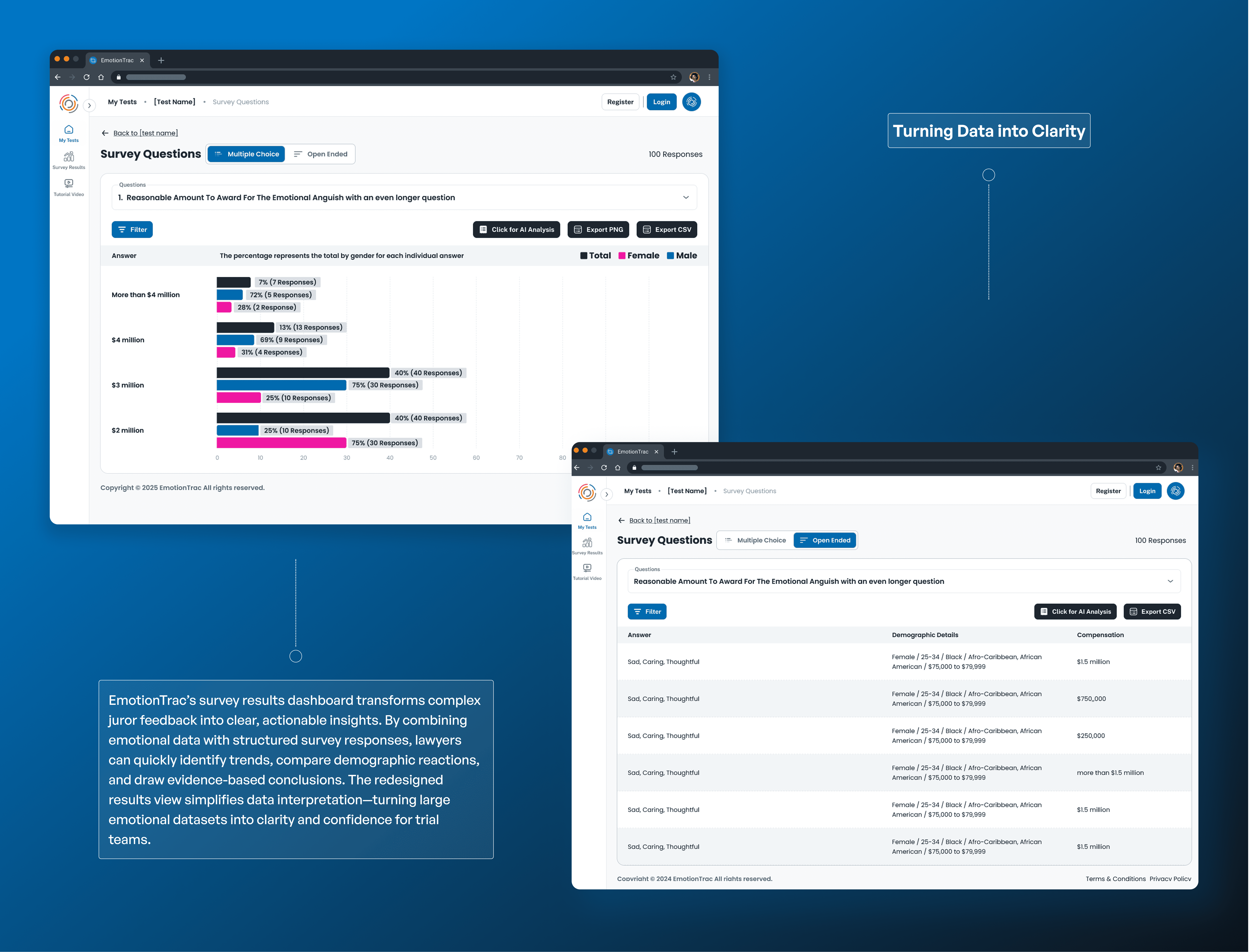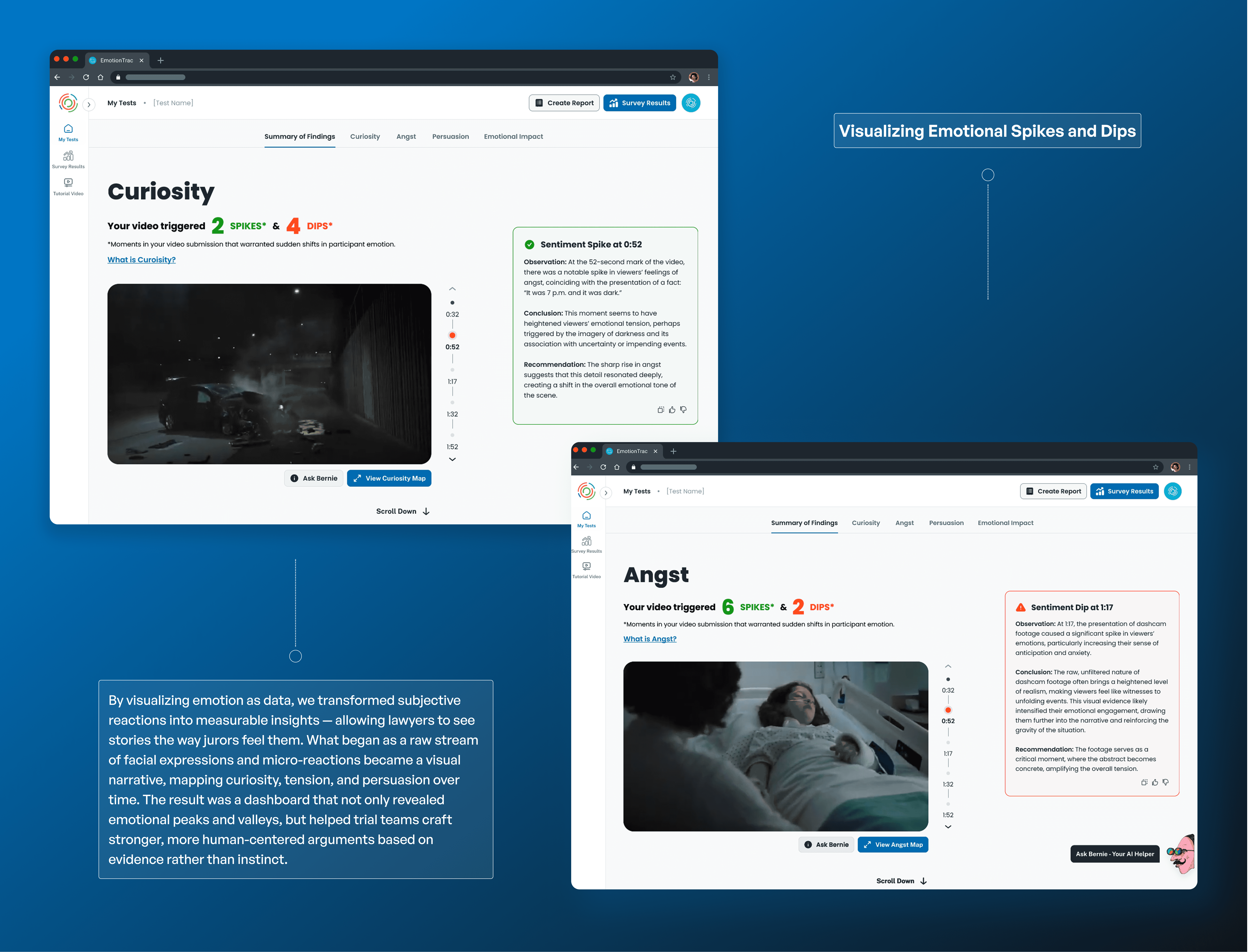 EmotionTrac is an AI-powered platform used by law firms to analyze how audiences emotionally respond to trial videos, depositions, and narratives. While the underlying data was powerful, the original dashboard overwhelmed users with dense charts and lacked a clear narrative, making it difficult for lawyers to extract actionable insights.